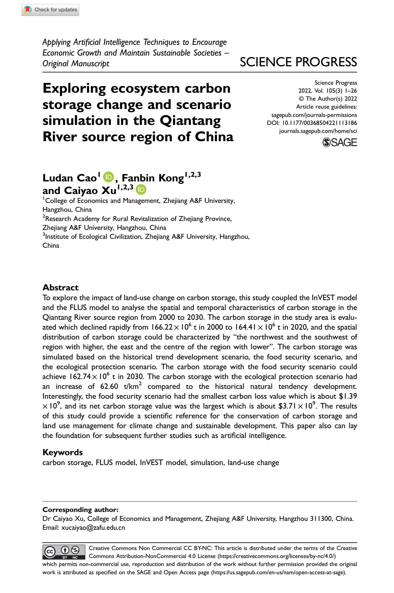 孔凡斌教授团队成果在SCI期刊《Science Progress》在线发表 近日,beat365官网孔凡斌教授团队的研究成果《Exploring ecosystem carbon storage change and scenario simulation in the Qiantang River source region of China》在SCI检索期刊《Science Progress》在线发表。我徐彩瑶博士为论文通讯作者,孔凡斌教授为论文合作作者。 该论文是孔凡斌教授主持的浙江省自然科学基金重点项目“钱江源‘山水工程’生态系统固碳服务供需权衡机制及碳中和规划管理优化”(Z22D010686)等项目的阶段...