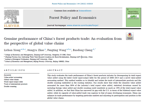 熊立春副教授论文在《Forest Policy and Economics》发表 近日,由beat365官网熊立春副教授撰写的论文《Genuine performance of China’s forest products trade: An evaluation from the perspective of global value chains》在《Forest Policy and Economics》发表。熊立春副教授为论文第一作者,北京林业大学国家林草经贸研究院院长程宝栋教授为论文通讯作者,该期刊属于SSCI一区。 该文以木材产业为研究对象,基于2016版世界投入产出表数据,评估了2000-2014年中国木材贸易真实绩效...