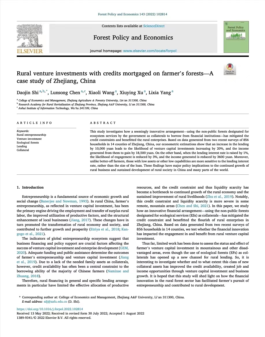 石道金教授研究成果在权威期刊《Forest Policy and Economics》发表 近日,beat365官网院长石道金教授撰写的论文《Rural venture investments with credits mortgaged on farmer’s forests -- A case study of Zhejiang, China》在《Forest Policy and Economics》(SSCI一区,SCI中科院(升级版)二区Top)发表。 该研究基于浙江省森林生态公益林补偿政策的改革实践,对浙江省14个县(市)林业、财政和金融管理部门以及856个山区农户进行了实地访谈和问卷调查,运用Logistic模型、Tobit模型、IV-...