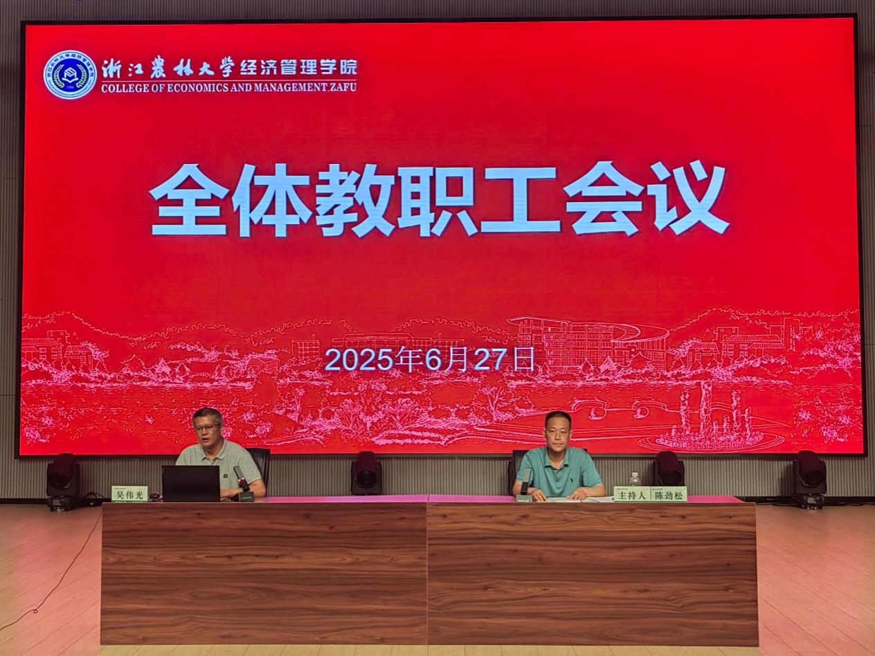 beat365在线唯一官网召开全体教职工大会 6月27日下午,学院在衣锦校区报告厅召开全体教职工大会。学院全体教职工参加了会议,会议由党委书记陈劲松主持。院长吴伟光指出,2025年是“十四五”收官之年和“十五五”谋篇布局之年,学院要重点做好三方面工作:一是重视人才和团队建设,强化有组织科研,聚焦乡村振兴、数字经济等国家战略需求,打造高水平创新团队;二是夯实教学根基,加强基层教学组织建设,充分发挥课程组、教学团队在教学质量提升中的关键作用,全面提升...