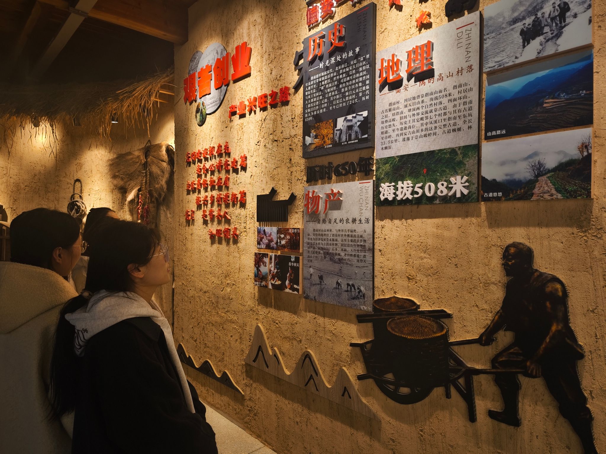 活动过程中同学们参观了红叶指南乡村振兴实践中心和文化礼堂,详细了解村庄通过生态资源开发推动产业融合的创新路径。村内古树、古井、古道等“七古”文化景观让大家深刻感受到传统村落保护与现代发展和谐共生的重要意义,提醒着学生党员们在关注经济发展的同时,也要注重文化传承和生态保护,实现可持续发展。在党群服务中心,同学们还通过历史照片和实物展陈,学习了指南村从“缺水少田”到“生态宜居”的奋斗历程,深刻体会到基层党组织在乡村振兴中的核心作用。