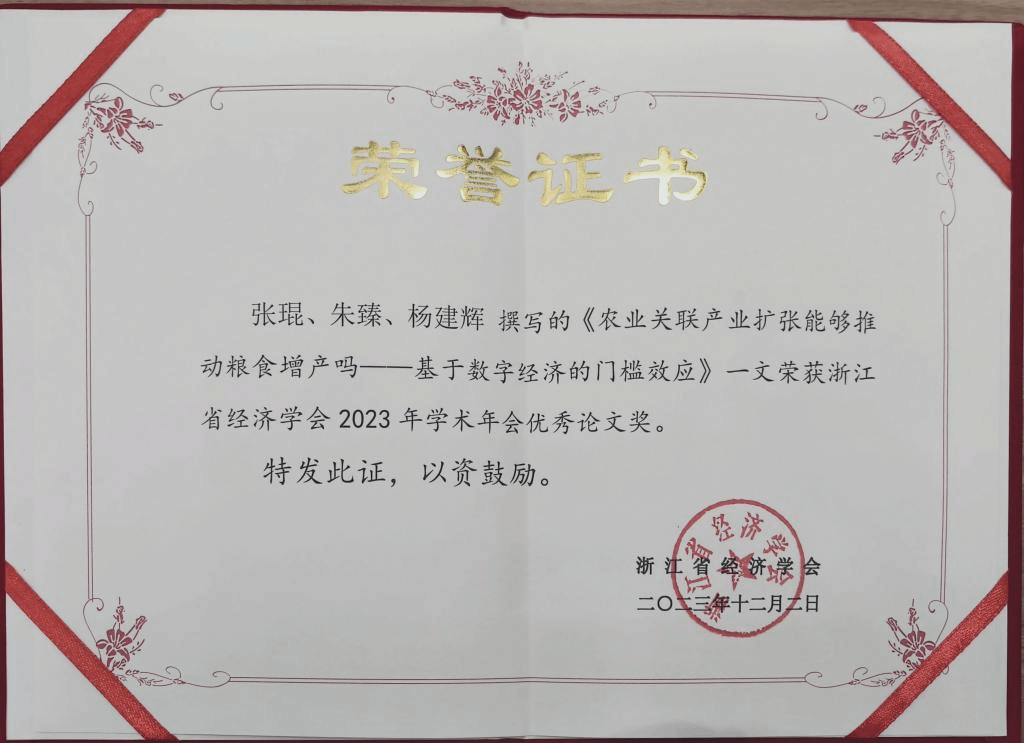 beat365官网由顾光同教授带队,博士研究生朱书琦,硕士研究生金欣怡、姚玉秀和张琨分别就《数字金融如何赋能农村产业高质量发展:来自2011—2021年省域面板数据的实证》、《用能权交易制度是否提升全要素能源效率?——基于中国地级以上城市的考察》、《中国环境税改革对绿色全要素生产率的影响研究——基于“费”改“税”的实证考察》和《农业关联产业扩张能够推动粮食增产吗——基于数字经济的门槛效应》在平行论坛进行汇报。会议共评选出10篇优秀论文,由张琨、朱臻、杨建辉撰写的论文《农业关联产业扩张能够推动粮食增产吗——基于数字经济的门槛效应》获“优秀论文奖”。