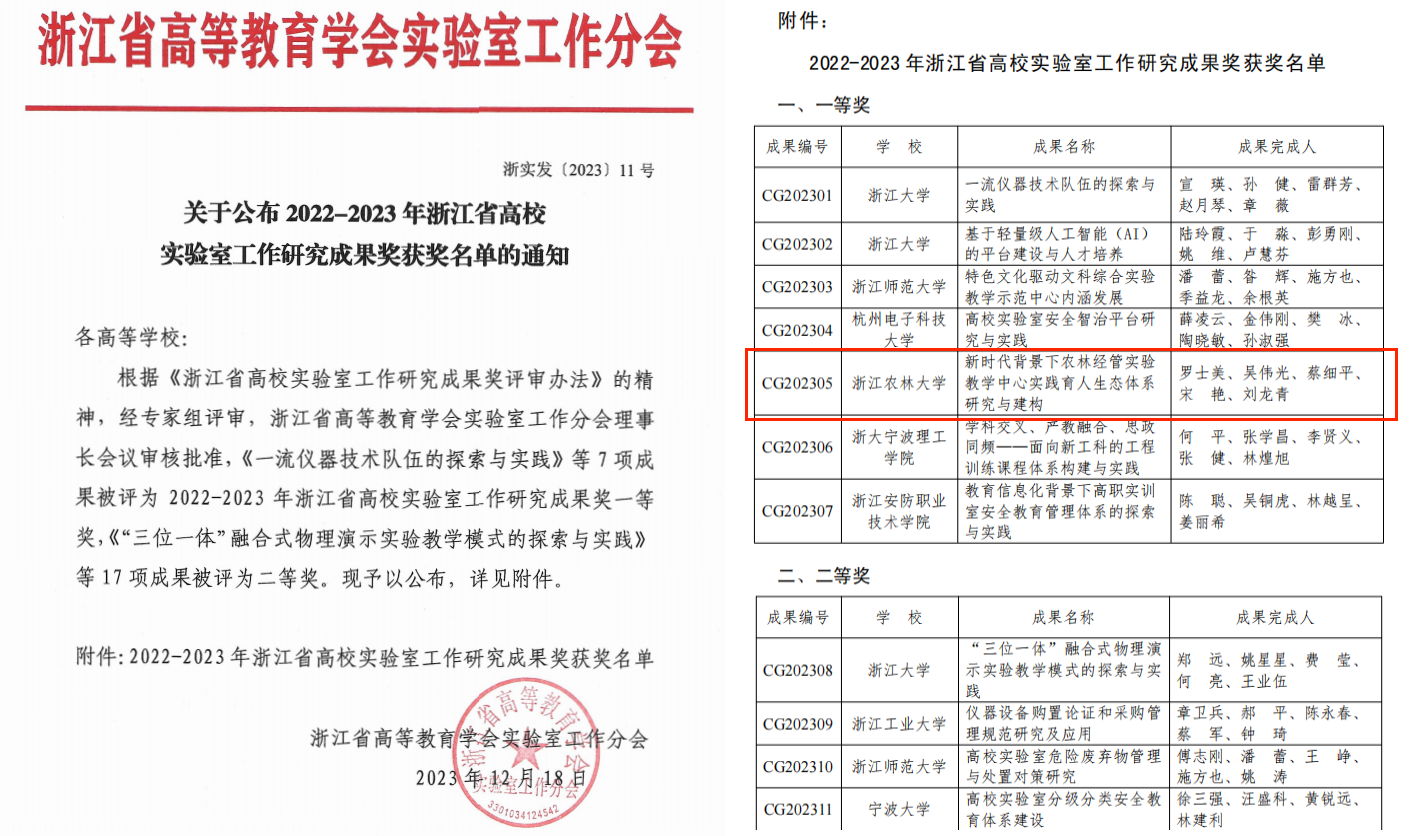 近日,据浙江省高等教育学会实验室工作分会发布《关于公布2022-2023年浙江省高校实验室工作研究成果奖获奖名单的通知》获悉,由beat365官网实验中心罗士美老师主持的“新时代背景下农林经管实验教学中心实践育人生态体系研究与建构”成果获得一等奖。本次全省高校实验室工作研究成果奖评比,共评出一等奖7项、二等奖17项。