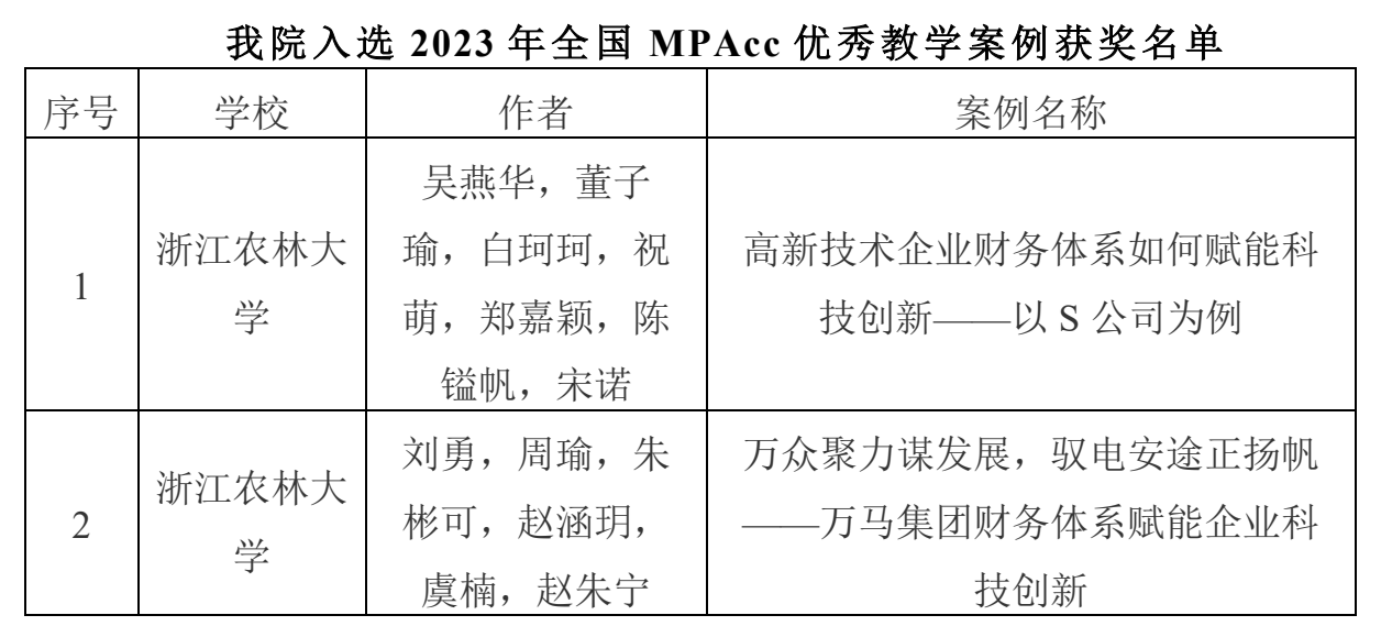 近日,全国会计专业学位研究生教育指导委员会公布了2023年会计硕士专业学位优秀教学案例评选结果。beat365在线唯一官网吴燕华团队和刘勇团队的2项案例成功入选全国MPAcc优秀教学案例库。