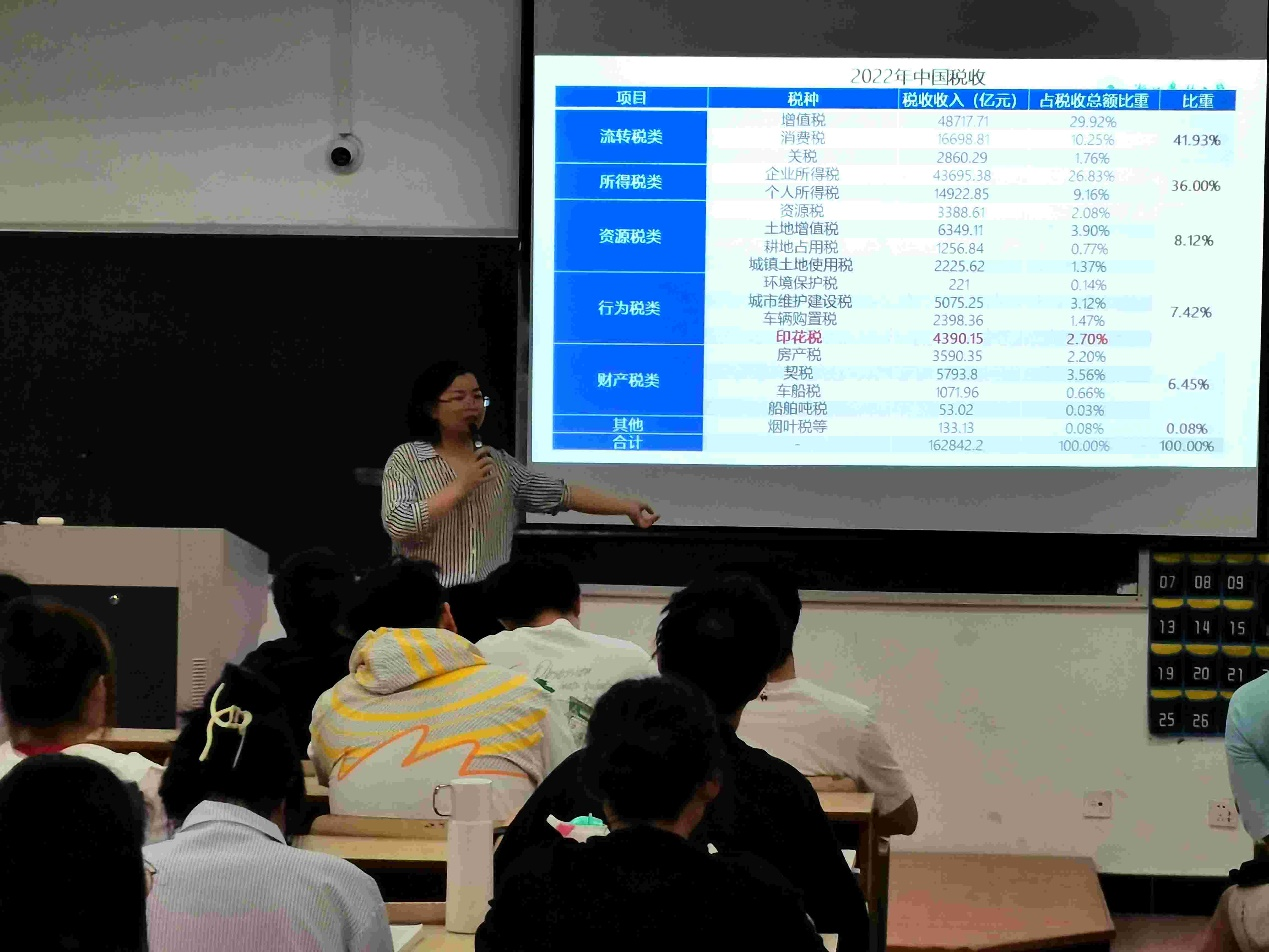 吴燕华老师以《税法》课程中“印花税”这一教学点为主题,从印花税的定义、起源、发展、社会生活中的应用、以及中美两国税制的差异,采用讲授式、启发式、案例式相结合的教学方式,把印花税知识点讲解得通透具有高阶性,呈现了一堂精彩的示范课。吴老师课堂教学组织严谨,课堂内容设计科学合理,熟练运用信息化教学手段,讲课投入。同时结合课程主题,联系社会生活提出问题,师生互动效果好,激发学生学习兴趣,给予学生思考、联想、创新和启迪。得到了听课教师们的一致好评