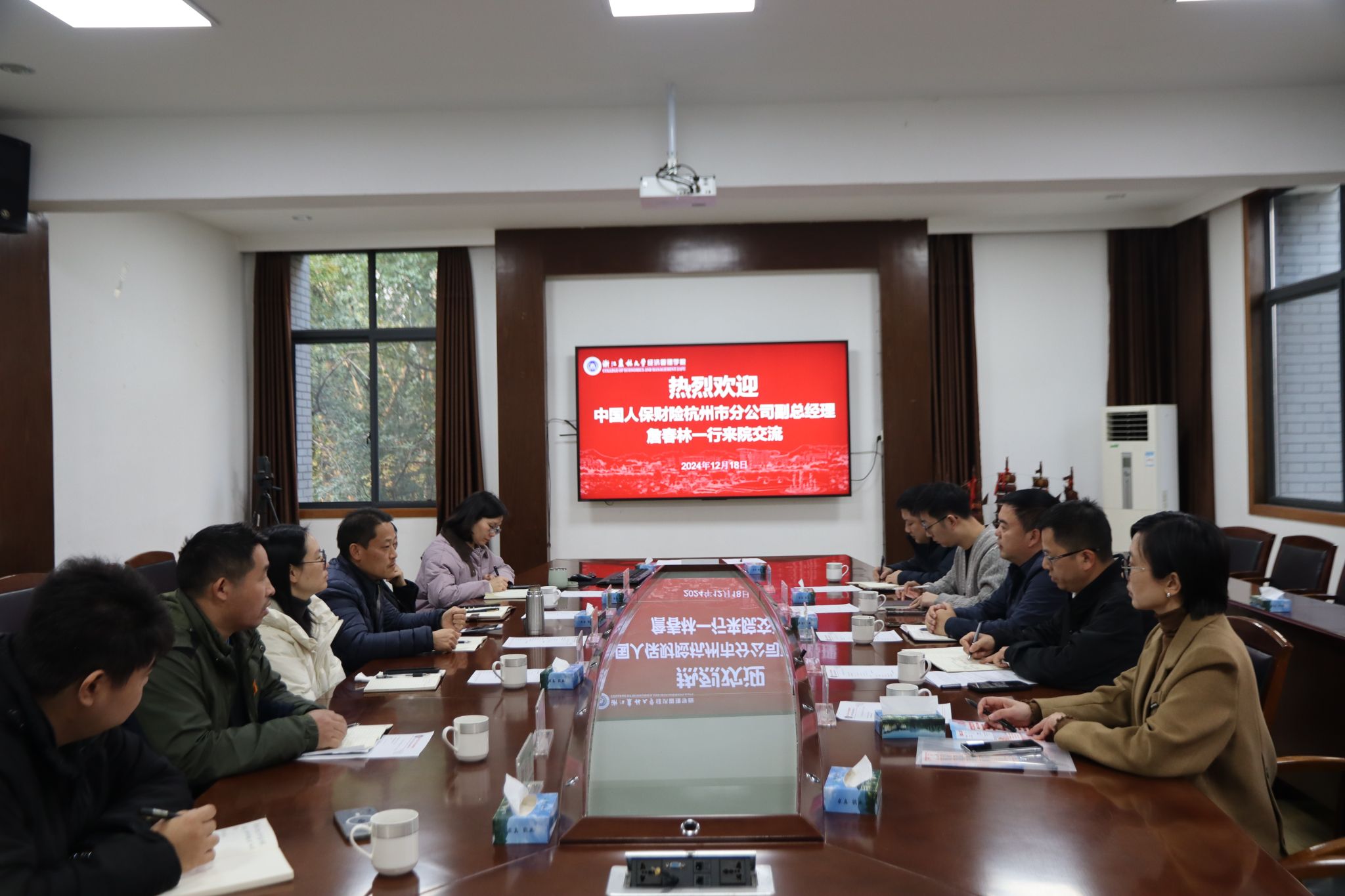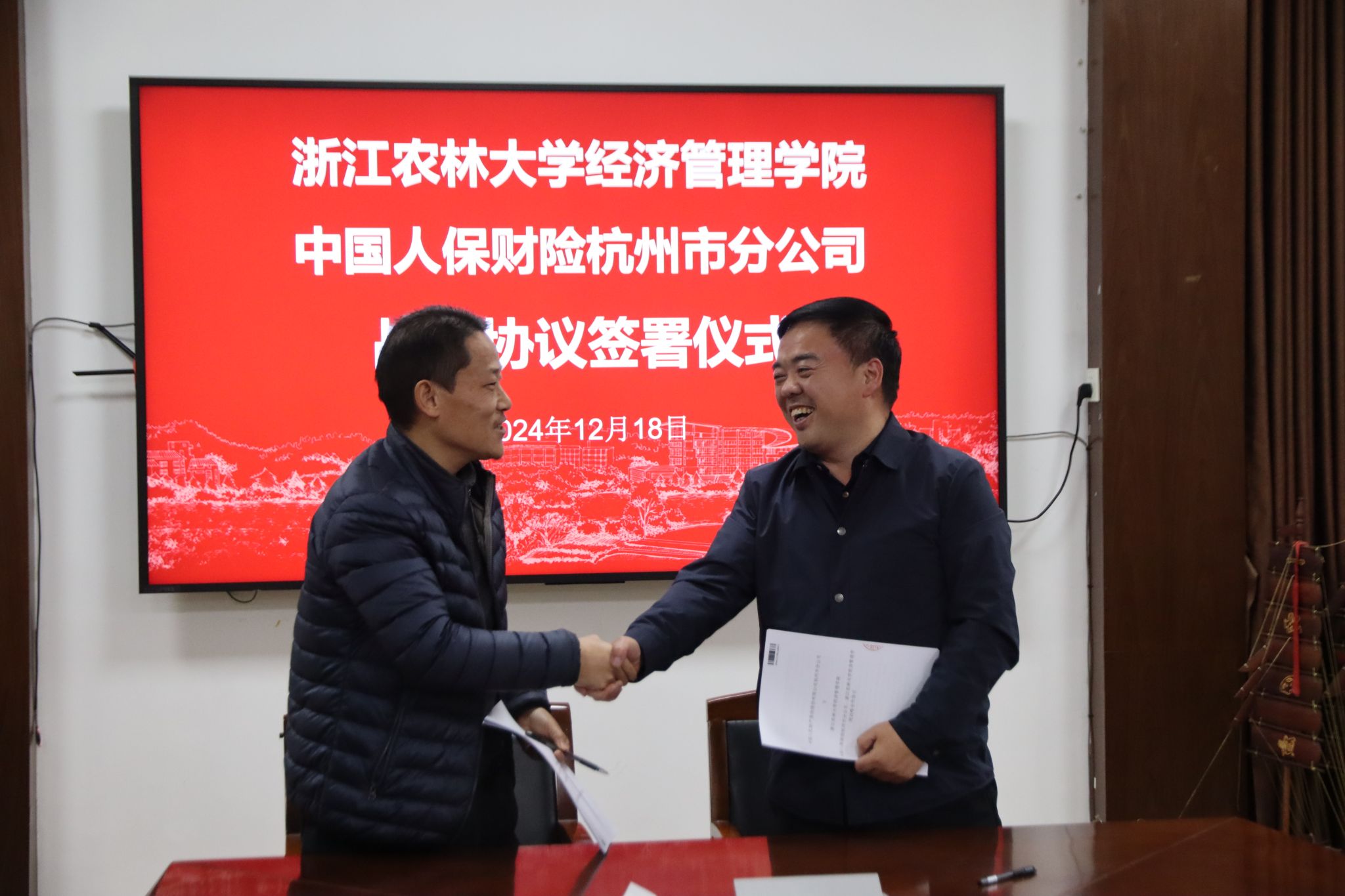 12月18日下午,beat365在线唯一官网与中国人保财险杭州市分公司战略合作协议签约暨实习实践基地授牌仪式在西大楼208会议室举行。中国人保财险杭州市分公司副总经理詹春林、beat365在线唯一官网党委书记陈劲松,双方团委、学科专业、行政人事及学生办等相关人员,参加了仪式。