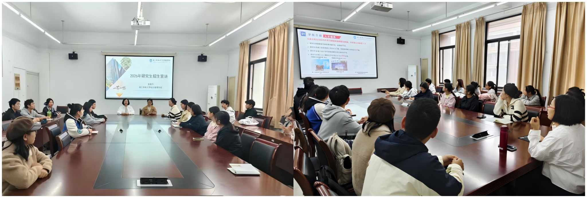 10月21日下午,学院农林经济管理学术型硕士点负责人沈政副教授首站走进衢州学院,与商学院谢璟晅老师及90余位2027届毕业生齐聚一堂。宣讲中,沈老师结合最新招生政策与历年数据拆解报考难度,详细介绍了学院研究生学位点核心优势,还通过详实案例展示学院研究生就业图景和培养特点,让学子直观感受“双导师制”与“硕博联动”的育人成果。