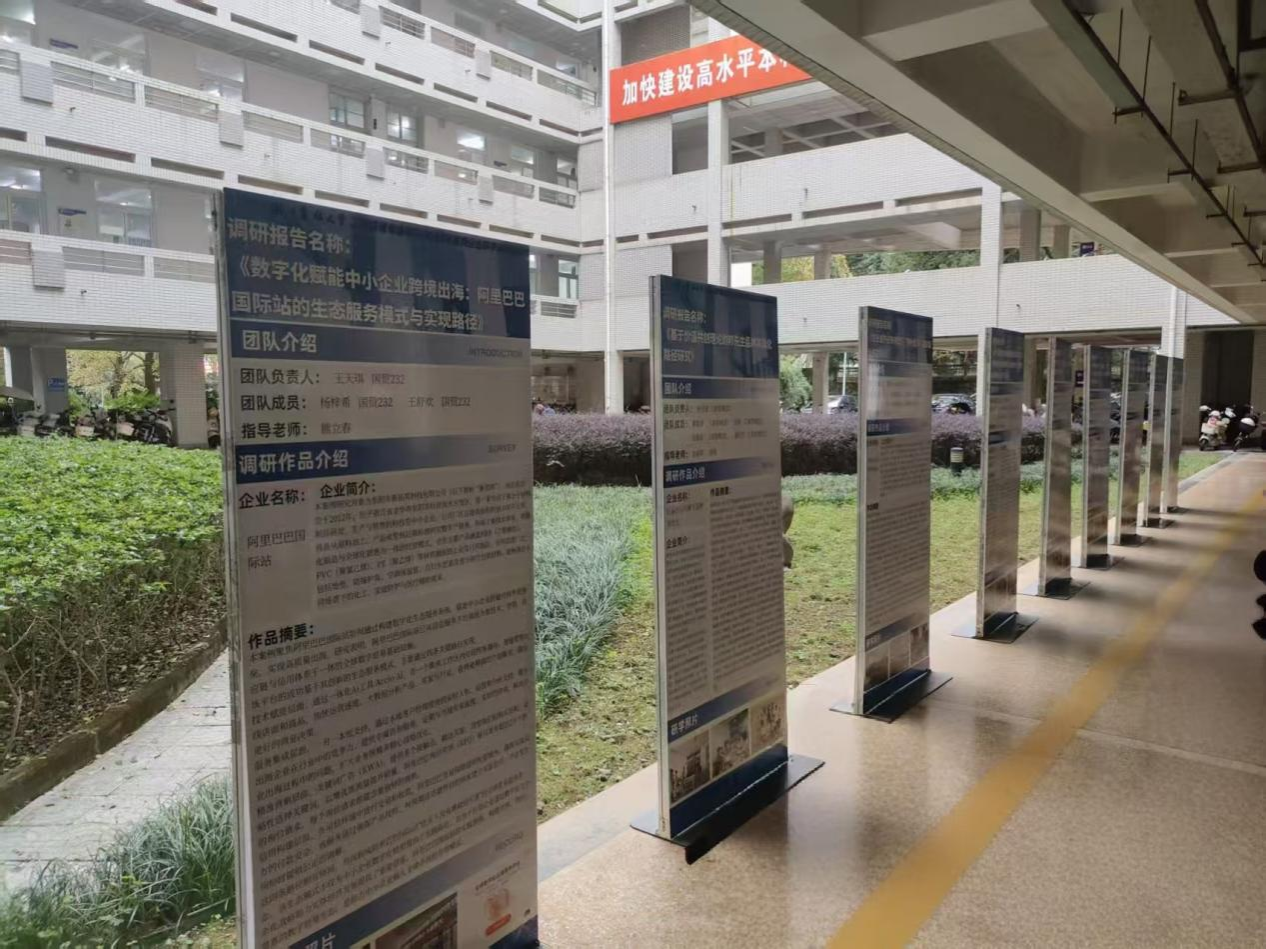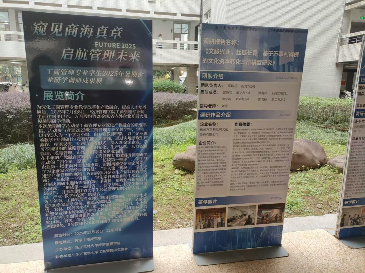 近日,由beat365在线唯一官网beat365在线唯一官网主办、工商管理研究协会协办的“窥见商海真章·启航管理未来”暑期企业调研成果展在衣锦校区成功展出。本次展览集中展示了2023级工商管理专业学生在2025年暑期赴阿里巴巴、万马股份等20余家知名企业开展研学活动的调研成果,吸引了大量师生驻足参观。