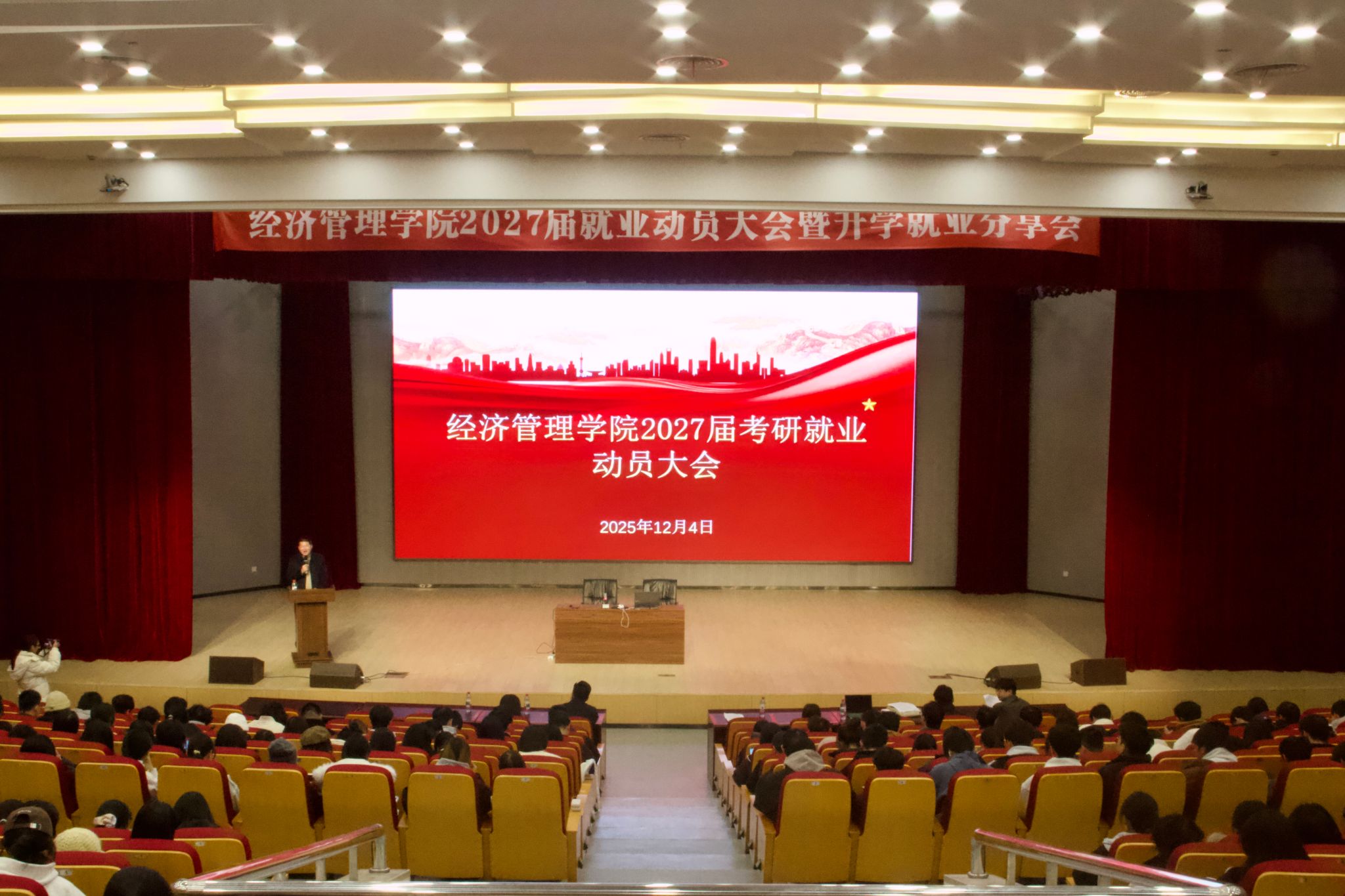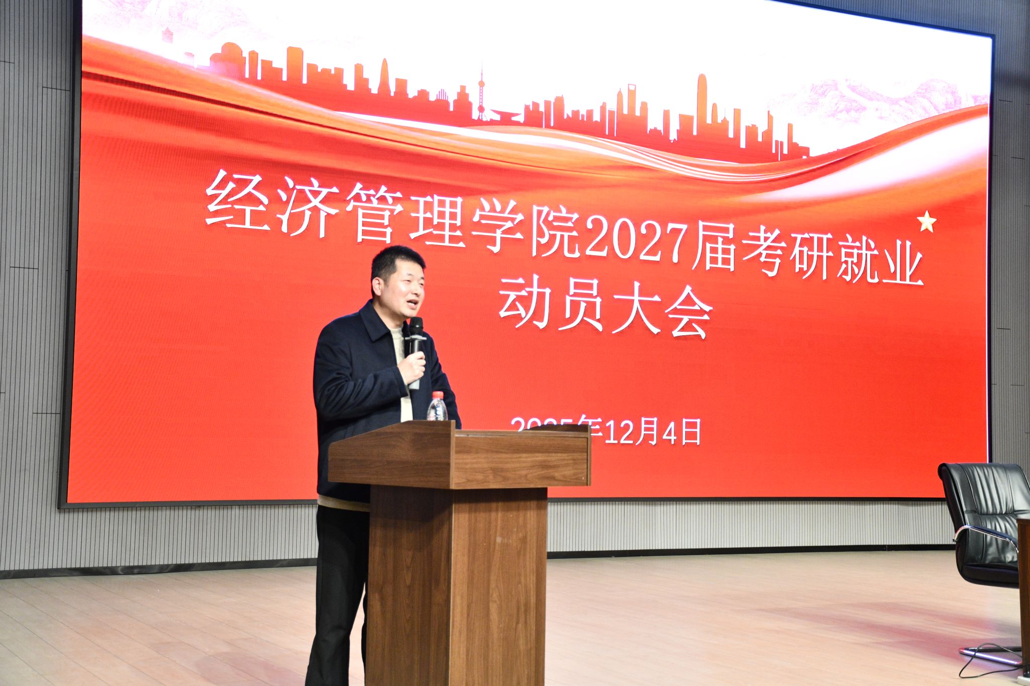 为全面部署学院2027届本科生升学与就业工作,beat365在线唯一官网于12月4日在衣锦校区报告厅召开2027届毕业生考研就业动员大会。院党委副书记曹磊出席大会并作动员讲话,年级辅导员与学生共同参会。