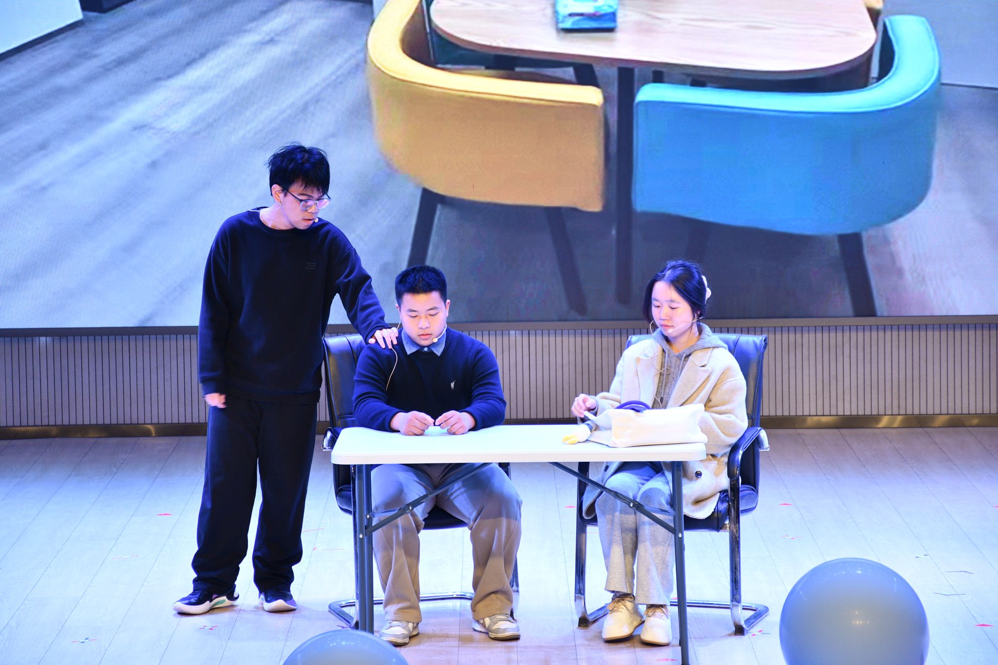 本次大赛以活力舞蹈《sushi power》燃情开场。《把心跳开成扬声器》解锁突破成长密码,《戒不掉的“掌中宝”》叩问数字时代依赖困境,《你曾是少年》唤醒青春共鸣,《透明的牢笼》勾勒心灵破茧轨迹,《内耗》探寻情绪调节力量,《黑白交锋》具象化内心抉择博弈,《我们的共鸣》编织情感联结纽带,《手机里的“减负”小记》勾勒心灵松绑日常,《逆时针对话》铺展自我和解旅程,《以歌为信,致少年时》寄寓未来热忱期许。整场晚会以剧话心、以艺传情,尽显经管学子观照内心、昂扬向上的青春风采。
