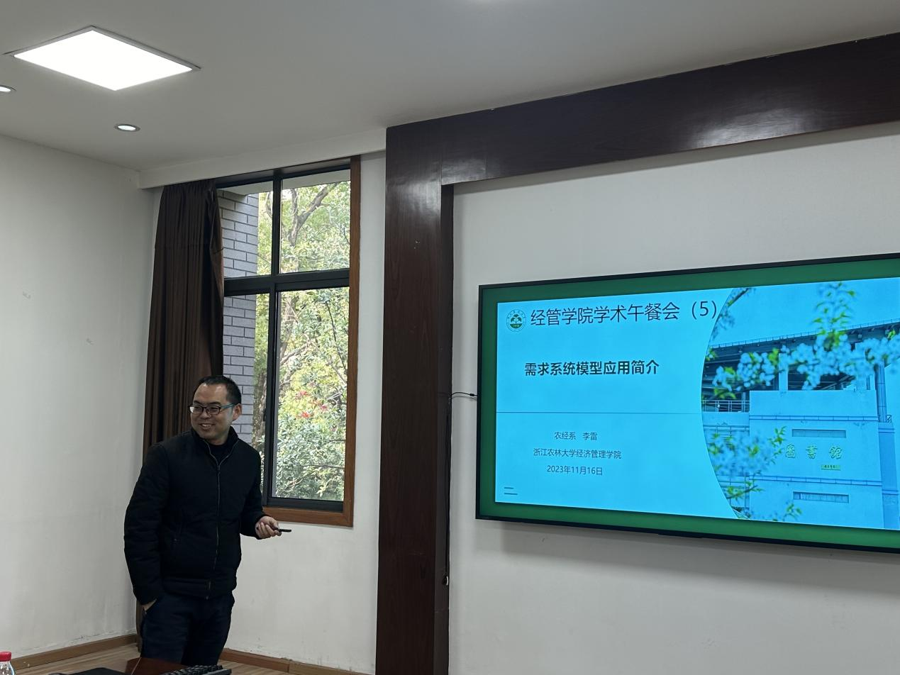 学术午餐会过程中,朱哲毅博士对参会老师表示欢迎。李雷博士从产生背景、应用情况以及实证部分系统介绍了需求系统模型,参会老师就该方法进行了热烈讨论,促进了后续研究的新发展。