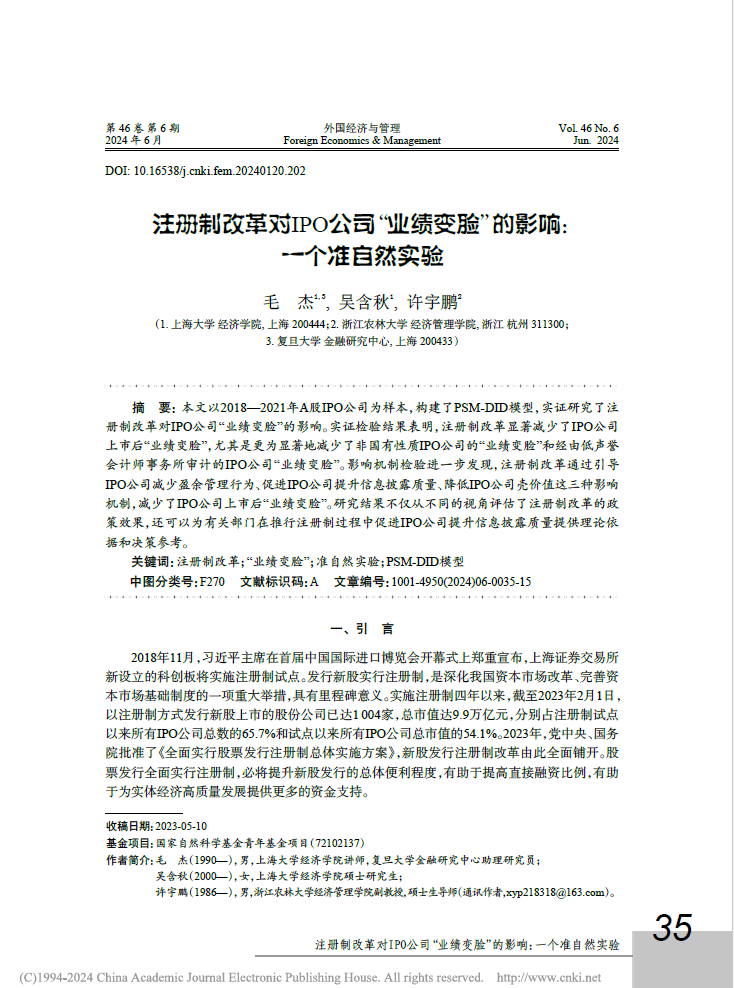 由beat365官网许宇鹏副教授作为通讯作者合作撰写的论文《注册制改革对IPO公司“业绩变脸”的影响:一个准自然实验》在《外国经济与管理》(学校A类期刊、CSSCI、FMS管理科学高质量期刊)2024年第6期上发表。该论文是许宇鹏副教授主持承担的国家自然科学青年基金项目的阶段性研究成果。