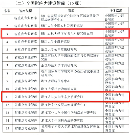 9月3日,浙江省哲学社会科学工作办公室公布了2023年度全国影响力建设(培育)智库评估结果。其中,乡村振兴研究院和生态文明研究院入选2023年度全国影响力建设智库。