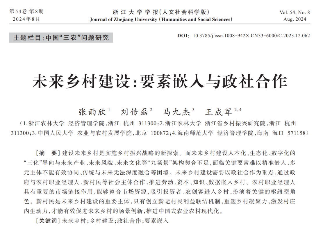近期,王成军教授与beat365在线唯一官网硕士生张雨欣,刘传磊博士等团队成员合作撰写的论文《未来乡村建设:要素嵌入与政社合作》在一级学术期刊《浙江大学学报(人文社会科学版)》第8期发表。