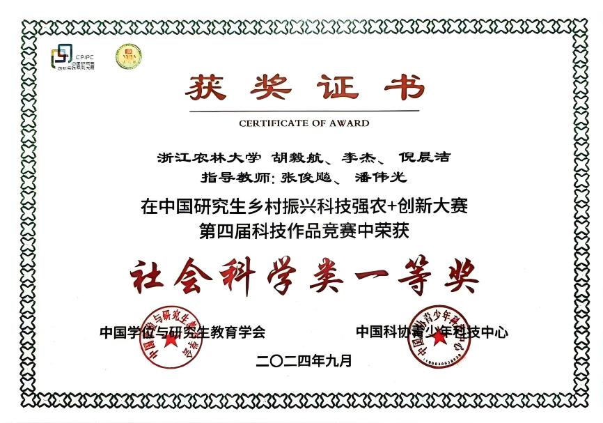 据悉,本次大赛由教育部学位管理与研究生教育司指导,中国学位与研究生教育学会和中国科协青少年科技中心主办,哈尔滨市委组织部与全国农业专业学位研究生教育指导委员会联合协办,东北农业大学承办。大赛以“聚焦‘三农’问题,服务乡村振兴;促进人才培养,激发创新活力”为宗旨,设立科技发明类、自然科学类和社会科学类三个赛道,共有来自156所高校和研究单位的868支队伍报名参赛,经过多轮专家评审和现场答辩,最终通过巅峰对决方式决出优胜者。其中在社会科学类赛道中,仅有6件作品获得一等奖殊荣。