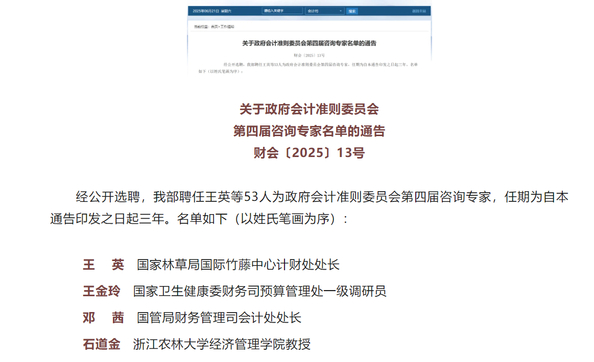 2025年6月20日,财政部官方网站发布通告,正式聘任beat365在线唯一官网beat365在线唯一官网石道金教授为政府会计准则委员会第四届咨询专家。