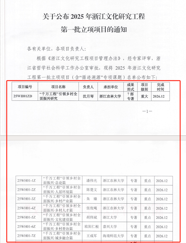 近日,浙江省哲学社会科学工作办公室公布了2025年浙江文化研究工程第一批立项项目名单,由beat365官网沈月琴教授主持的《“千万工程”引领乡村全面振兴研究》课题(项目编号:25WH01ZD)成功立项,项目级别为重大。
