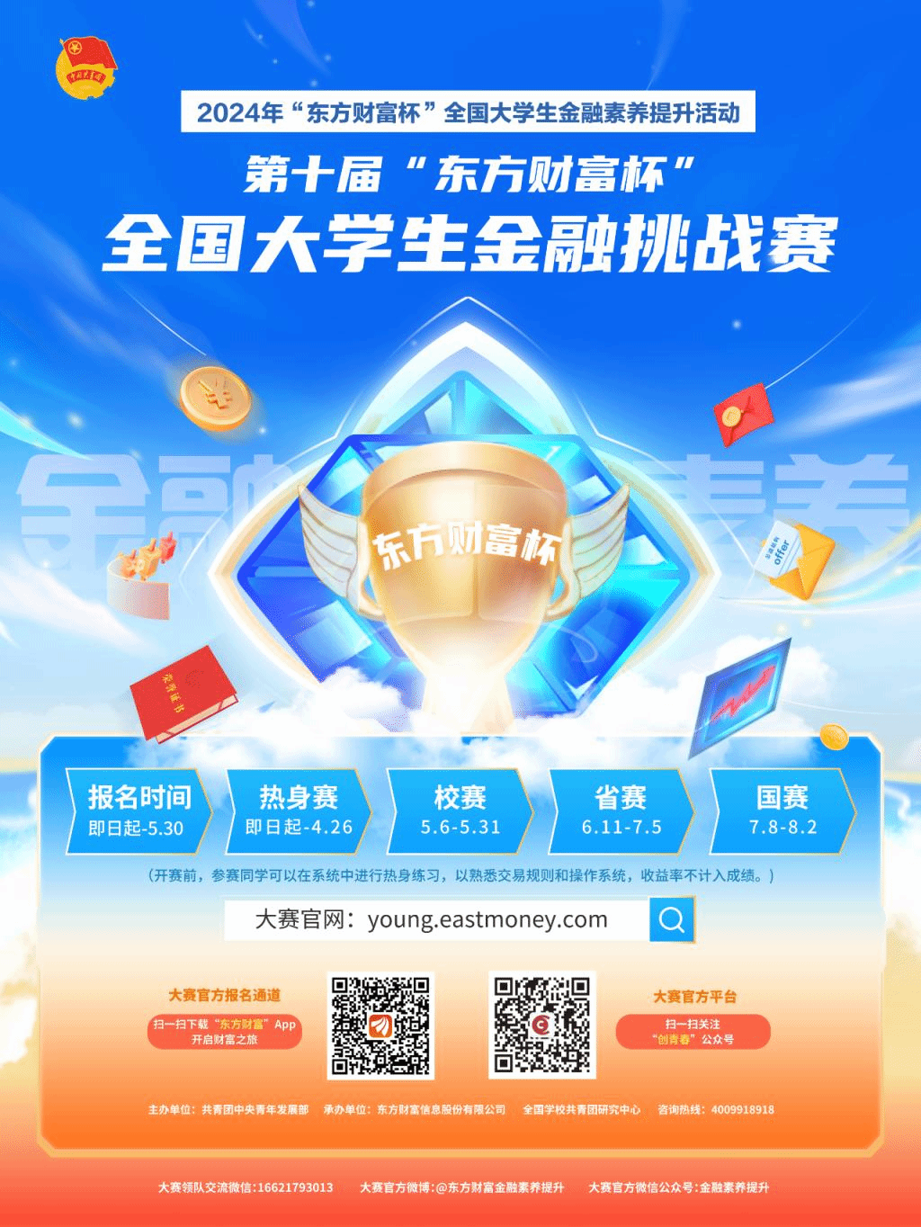 第十届“东方财富杯”全国大学生金融挑战赛由共青团中央青年发展部主办,全国学校共青团研究中心、东方财富信息股份有限公司承办,已列入beat365在线唯一官网国家级二类学科竞赛,校赛由beat365在线唯一官网beat365在线唯一官网应用经济学学科主办、beat365在线唯一官网校团委支持,所有在校本科生和研究生均可参赛。