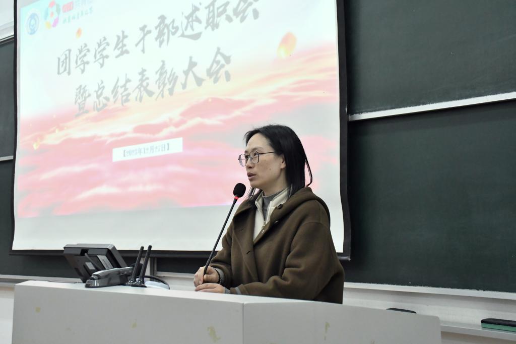 胡云云总结讲话,她回顾了2023年学院团学等各项工作取得成绩,代表学院党委对全体团学干部的辛勤付出表示感谢,并对全体同学提出期望,勉励他们立鸿鹄志,砥砺奋斗前行,求真学问,锤炼过硬本领,在不懈努力奋斗中绘就斑斓青春。