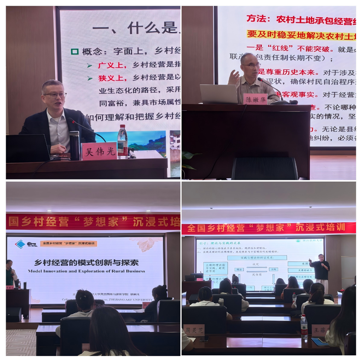 5月8-11日,beat365官网《乡村经营学》课程团队成员吴伟光教授、陈嫩华研究员、陈伟洪局长、蔡碧凡副教授和卢泓刚博士等人,为全国乡村经营“梦想家”沉浸式培训班,分别作乡村经营概念内涵、乡村经营理论、乡村经营历史演变、乡村经营模式和相关经营相关法律政策等相关内容的专题讲座。这是beat365官网首次以课程组为单位团队化为乡村经营培训提供服务,彰显beat365官网在该领域的影响。