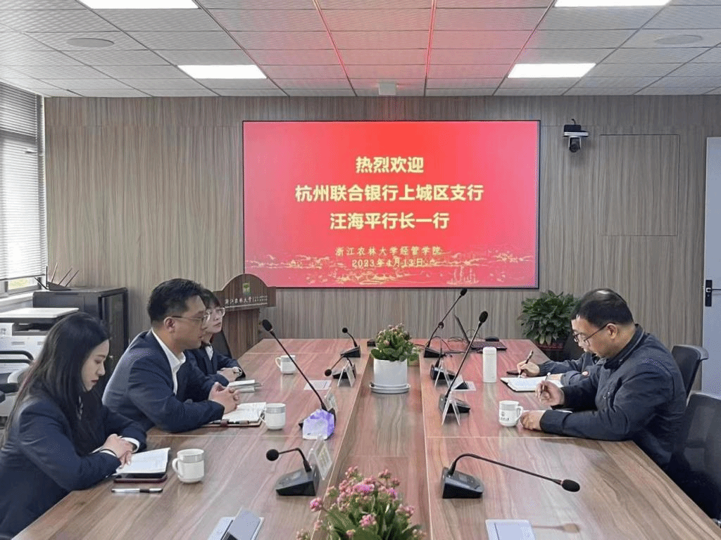 beat365在线唯一官网与杭州联合银行上城区支行洽商合作 4月13日,杭州联合银行上城区支行汪海平行长一行赴beat365在线唯一官网洽商银企合作。beat365在线唯一官网党委书记周凯以及国际商务专硕学位点负责人、生态文明研究院办公室主任钱志权参与洽谈。 学院党委书记周凯对汪海平杭州一行的到来表示热烈的欢迎,并介绍了学校办学历史、学院学科专业发展现状。汪海平行长介绍了杭州联合银行历史沿革和主要业务情况。双方就建设本科实践教学基地、国际商务研究生工作站、党建联建、绿色金融研究与...
